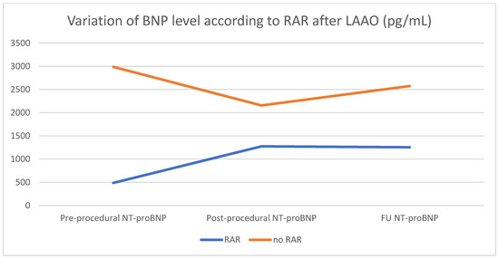 Blood samples including natriuretic peptides (B-type natriuretic peptide (BNP)) were collected according to a standardized method before the procedure, 48 h after the procedure and at distance. Firstly, the concentration of the BNP is not different between the two groups according to the presence or not of adverse remodeling of the left atrium, whatever the time of blood sampling. The results are summarized in Table 3. However, we noted that the patients with RAR had a trend of BNP increasing just after the device implantation, then stabilizing, while in those without RAR, a decrease in the BNP level after LAAO was observed (Figure 3). This correlation between RAR and increase of the BNP level after LAAO could be explained by the loss of reservoir function of the left atrium after LAAO, before an adaptation.