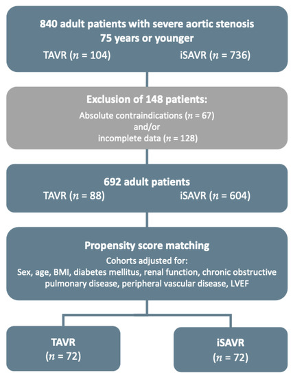 Patient selection and propensity score matching flow-chart (BMI—body mass index, LVEF—left ventricular ejection fraction).