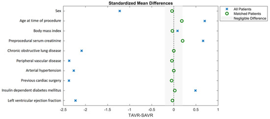 Baseline characteristics, procedural characteristics and adverse events for the unmatched and matched population are presented in Table 2, Table 3 and Table 4, respectively. Eighty-eight TAVR patients and 604 iSAVR patients were included in the retrospective analysis (64.1 ± 9.5 years, 287 (41.5%) female, median follow-up 5.5 years (2.2–14.1 years)). After propensity score matching, 72 matched pairs were compared. The cohorts did not differ regarding baseline characteristics used for adjustment in the analysis model (Figure 2). No differences were observed in the EuroSCORE II (4.3 ± 3.2% vs. 6.4 ± 4.3%; p = 0.194). However, patients undergoing TAVR had more often been treated with a percutaneous coronary intervention (PCI) prior to the procedure (TAVR: 19.4% vs. iSAVR: 5.6%; p = 0.021).