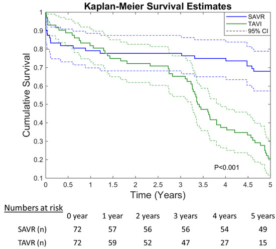 The 5-year Kaplan–Meier curve is depicted in Figure 3. Although TAVR was associated with an improved 30-day survival, iSAVR patients had higher long-term survival rates (p < 0.001).