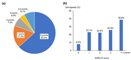 The SARC-F score distribution was 0 points in 428 (63%) patients, 1 point in 117 (17%), 2 points in 49 (7%), 3 points in 27 (4%), and ≥4 points in 55 (8%). The distribution of the SARC-F scores and the frequency of sarcopenia in each SARC-F score are shown in Figure 1.