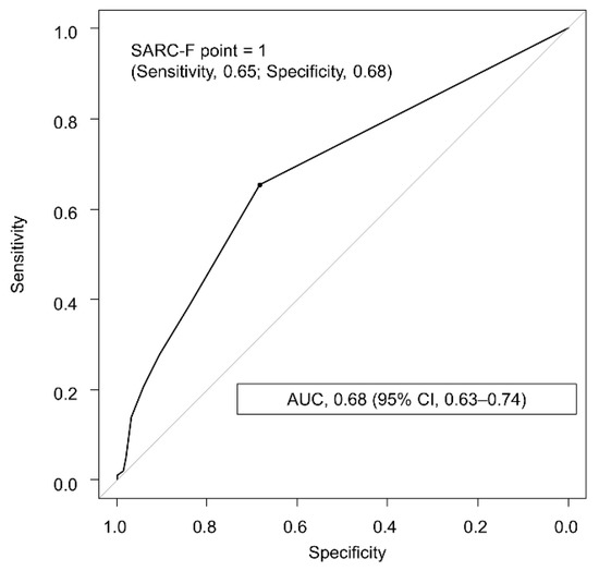 Receiver operating characteristic curve of the SARC-F for identifying sarcopenia in patients with chronic liver disease. The optimal cutoff value was determined using the highest Youden index value. AUC, area under the receiver operating characteristic curve.
