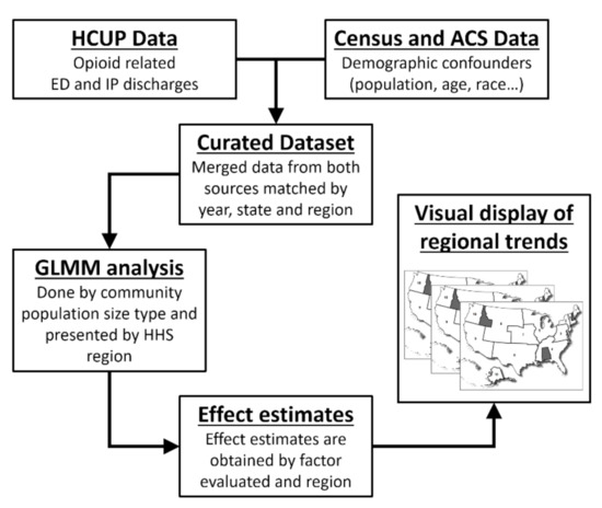 United States Department of Health and Human Services region plots were generated using least square mean estimates for each model fitted. These values were coded with three color gradients (green-white-red) based on their numeric estimate value starting from dark green for the least affected region to dark red for the worst affected region, white being in the center indicating neutrality. HCUP and Census demographic covariate associations were generated and are presented as estimate difference values, where the estimate value represents the value increase per unit of increase or decrease in the covariate units for continuous variables and as a difference from the reference category set arbitrarily for categorical values. All analyses were performed on SAS/STAT v.9.4 (SAS Institute Inc., Cary, NC, USA). Statistical significance was set at p ≤ 0.05. Multiple testing correction is highlighted when achieved and was performed through the Bonferroni method. A curated dataset is available as a Supplementary File. A visual representation of the methodological process is displayed in Figure 1.