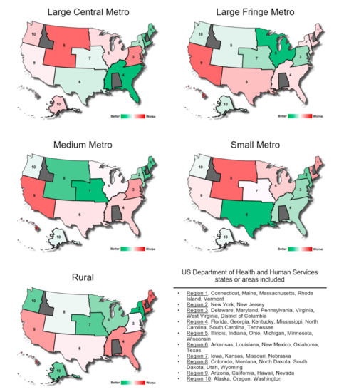 Alternatively, the current study used a novel analysis which found several trends. It was found that higher opioid usage correlates with Region 1. The Midwest had the highest opioid use, which correlates with Regions 6, 7, and 8 in this study. Usage was also consistently high in large central metro population centers in this study. The current study used additional regional stratifications, allowing high opioid usage levels to be identified in large central metro areas in Region 8, in small metro areas in Region 8, and in large fringe metro areas in Region 6, but not in medium metro or rural areas. Previous studies also found rates of opioid usage were highest in the large fringe metro and medium metro areas in the southern region. This trend held true in the current study and was particularly evident in Region 6; however, the current study also found rural areas in this region not lagging far behind in their opioid usage. In addition, Region 4 showed high rates of opioid usage in rural areas but not in small metro or large central metro population centers. Further to the West, past studies (i.e., since the mid-2000s) found rates to be consistently higher in small and medium metro areas and non-metro areas. Correlating the data from these previous studies with the analogous Regions 9 and 10 in the current study, it becomes essentially impossible to determine a definitive trend in opioid usage among different size population centers. While Region 9 has the highest incidence of opioid-related hospital visits in medium metro and large fringe metro areas followed closely by rural areas, Region 10 shows comparably lower incident levels with the notable exception of large central metro areas.