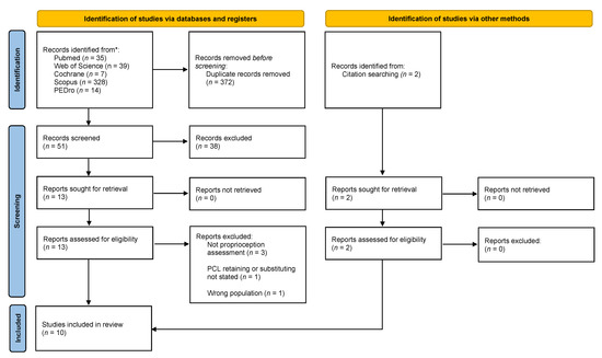 | PubMed | (“propriocept*”[All Fields] OR “Proprioception”[MeSH Terms]) AND (“total knee arthroplasty”[All Fields] OR “TKA”[All Fields] OR “TKR”[All Fields] OR “total knee replacement*”[All Fields] OR “arthroplasty, replacement, knee”[MeSH Terms]) AND (“PCL”[All Fields] OR “Posterior Cruciate Ligament”[All Fields] OR “Posterior Cruciate Ligament”[MeSH Terms]) |