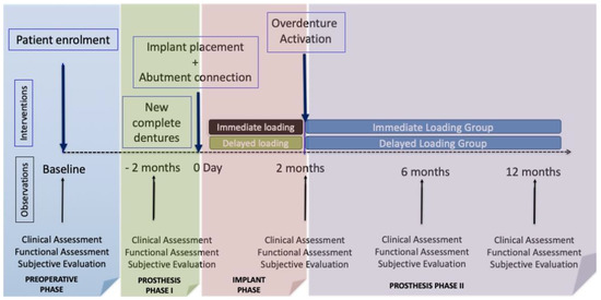 This triple-blind randomized clinical trial (RCT) aimed to compare the clinical, functional, and subjective outcomes of patients who were initially fitted with new complete dentures and wore them for two months, after which the dentures were replaced by mandibular overdentures retained by two implants that were subjected to either immediate loading or conventional loading (functional load two months after implantation). The design of the study allowed two types of comparison to be made (Figure 1): cross-over (on comparing the intra-subject results at the beginning with new prostheses for two months and overdentures during twelve months) and also in parallel (comparing the results of overdentures with or without immediate loading). Since it would not be possible to have a control group (conventional complete prosthesis) blinded to the test treatment, we used pre-post controls (intra-subject comparisons before and after treatment).