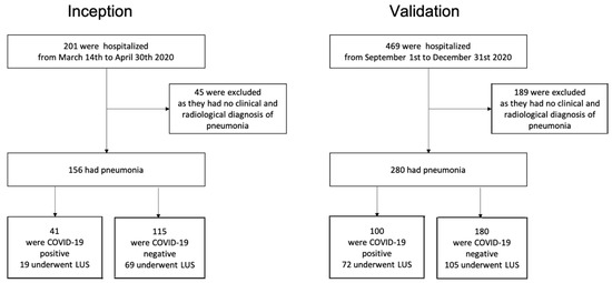 The main goal of this study was to evaluate the accuracy of performing blood leucocyte count to predict SARS-CoV-2 diagnosis in patients hospitalized for pneumonia not requiring either invasive or non-invasive ventilator support. In addition, the diagnostic accuracy of blood leucocyte count in combination with LUS was evaluated. The results were analyzed according to a retrospective, observational, case-control design during the first (inception cohort) and second (validation cohort) pandemic waves.
