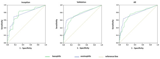 Results of binary logistic regression analysis indicated (coefficient ± SE) that only eosinophils (−0.013 ± 0.005, p = 0.009) and basophils (−0.026 ± 0.011, p = 0.016) were independently associated with COVID-19 diagnosis. Therefore, we restricted the analysis on susceptibility to COVID-19 pneumonia to eosinophils and basophils only. ROCs for basophils and eosinophils in diagnosis of COVID-19 pneumonia in inception, validation, and combined cohorts are shown in Figure 2, and their AUC in Table 2. The AUCs were highly significant for all cell types in all cohorts. Optimal cutoff values for basophil and eosinophil count generated in the inception cohort were confirmed in the validation cohort (Table 2).