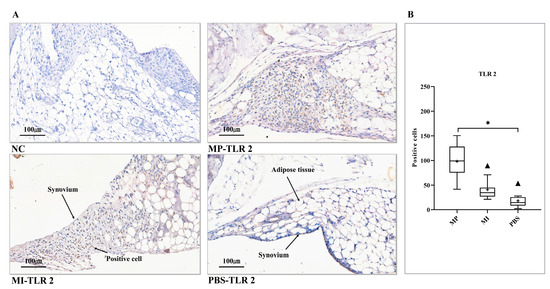 Thickened synovial tissues were found in both the MP and the MI groups. Several TLR 2-positive cells were also visualized in both the MP and the MI groups (Figure 2A). However, from the results of the histomorphometrical analysis, only the MP group showed significantly upregulated TLR 2 expression levels in comparison with the PBS group (p < 0.0167) (Figure 2B).