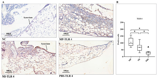 Figure 3. Expression of TLR 4 in the synovial layer of knee joints. (A) NC, no positive cell was found. MP-TLR 4 showed inflammatory cell infiltration accompanied by the adjacent adipose tissue loss. MI-TLR 4, some positive cells were observed in the thickened synovium. PBS-TLR 4, scattered positive cells were found in the synovium. (B) Histomorphometrical analysis of TLR 4 expression levels in three groups (One-way ANOVA (Tukey’s test)). (+) and (▲) symbols represent the mean and outlier values, respectively. NC, no primary antibody control; MP, metal particles; MI, metal ions; PBS, phosphate-buffered saline; TLR, Toll-like receptor. (Scale bars = 100 µm; * = p < 0.0167).