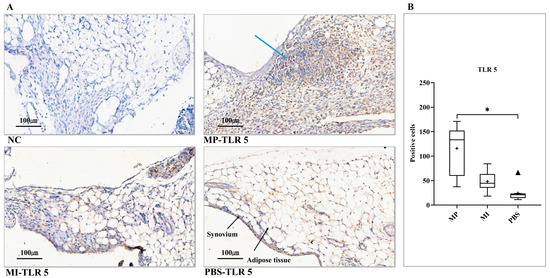 Due to the exposure to metal particles, non-specific granulation tissue was seen, quite similar to granulomatous tissues (pseudotumors) obtained from revision surgeries [38,39]. Additionally, accompanied by the formation of granulomatous structures, extensive adjacent adipose tissue seemed to disappear in the MP group (Figure 4A, MP-TLR 5). Although there was no granulation tissue in terms of the MI group, a thickened synovial layer was observed (Figure 4A, MI-TLR 5). For the histomorphometrical analysis, only the MP group had significantly elevated expression of TLR 5 compared to the PBS group (p < 0.0167) (Figure 4B).