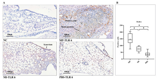 The debris-induced necrotic tissue was present in the MP group, characterized by a central area of necrosis containing greenish corrosion metal particles, black metal particles, and numerous debris-loaded macrophages (Figure 5A, MP-TLR 6). Commonly, corrosion metal particles appear greenish, while conventional metal particles were mainly black at microscopy [40], consistent with what we found in the necrotic tissue of this study. Around the necrotic tissue, numerous TLR 6-positive macrophage-like cells and TLR 6-positive spindle-shaped, fibroblast-like cells were observed. In the MI group, many TLR 6-positive cells were also found in the obvious thickened synovium (Figure 5A, MI-TLR 6). In terms of the histomorphometrical analysis, the MP group showed greatly increased TLR 6-positive cells compared to the MI group and the control group (PBS), and meanwhile, the MI group had more TLR 6-positive cells compared to the control group (p < 0.0167) (Figure 5B).