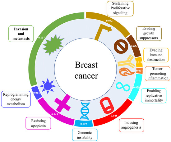 Outline of the ten hallmarks of cancer with PubMed association score for each hallmark keyword with breast cancer. The association score of each of the hallmarks, represented by one of the keywords: “proliferation”, “growth”, “immune”, “inflammation”, “immortality”, “angiogenesis”, “mutation”, “apoptosis”, “metabolism”, “metastasis”, AND “breast cancer” was calculated using PubMed citations. The number of citations for each hallmark with breast cancer was then divided by the number of each query term alone according to the following equation: association score = (citations of “keyword” for each hallmark AND “breast cancer”)/(citations of “keyword” for each hallmark). Note that the association score of invasion and metastasis is significantly higher than the other hallmarks, suggesting that this hallmark is highly explored and should be considered a prime therapeutic target.
