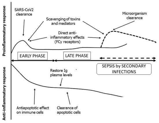 As described above, sepsis and septic shock result from complex dysregulation of the inflammatory and immune response [22] that is quite similar to immunological derangement observed in critical COVID-19 patients. Immunoglobulins have pleiotropic effects on the inflammatory–immune response including toxin scavenging, microbial phagocytosis, anti-inflammatory effects and antiapoptotic actions on immune cells [21,23,24,25,26,27]. Although guidelines do not indicate the use of intravenous polyclonal immunoglobulin (IVIg) in patients with bacterial infections [28], several studies showed a potential benefit in patients with sepsis and septic shock [24,25,29,30,31], and IVIg are commonly used as adjunctive therapy in immunocompromised patients with infections [26,32]. Therefore, adjunctive therapy with IVIg may also have rationale in the management of COVID-19 patients that depends on the disease phase and the related pathobiological phenotype. For instance, although the role of persistent viremia and viral activity in tissues is unclear, Ig may have a role in the early phases of COVID-19 by reducing the viral burden and by scavenging or downregulating the production of high levels of inflammatory mediators. In the late phases, especially in ICU patients with secondary bacterial infections, IVIg may have an important synergic activity in the empowerment of antibiotic efficacy and in supporting the overt immune dysfunction [33] (Figure 1).