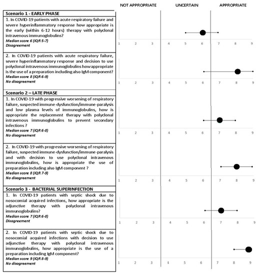 - In COVID-19 with progressive worsening of respiratory failure, suspected immune dysfunction/immune paralysis and low plasma levels of immunoglobulins, how appropriate is the replacement therapy with polyclonal intravenous immunoglobulins to prevent secondary infections?Consensus rating: appropriate; median score, 7 (IQR, 6–8); disagreement: no.