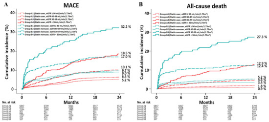 The study population was recruited from the Korea AMI Registry (KAMIR) [4]. Details of this registry can be found on the KAMIR website (http://www.kamir.or.kr (accessed on 15 April 2021). All patients aged ≥18 years at the time of hospital admission were included. The KAMIR was established in November 2005 and involved more than 50 communities and teaching hospitals in South Korea. A total of 45,555 patients with AMI who underwent successful stent implantation and who were not receiving continuous renal replacement therapy including hemodialysis or peritoneal dialysis between January 2006 and June 2015 were eligible for inclusion in this study. Patients with the following were also excluded: deployed bare-metal stents (n = 2362, 5.2%) and first-generation DES (n = 11,166, 24.5%), incomplete laboratory results (n = 8330, 18.3%), loss to follow-up (n = 2247, 4.9%), post-percutaneous coronary intervention (PCI) thrombolysis in myocardial infarction (TIMI) flow grade <3 (n = 2089, 4.6%), in-hospital death (n = 447, 1.0%) and treatment with other kinds of statins, except for atorvastatin, rosuvastatin, simvastatin, pitavastatin, pravastatin and fluvastatin (n = 39, 0.09%). Thus, a total of 18,875 AMI patients who underwent successful PCI with a newer-generation DES were included. The types of new-generation DESs used are listed in Table 1. Among the AMI patients, 16,055 (85.1%) were classified into group A (statin users) and 2820 (15.0%) into group B (statin nonusers). Thereafter, groups A and B were further subclassified into groups A1 and B1 (eGFR ≥ 90 mL/min/1.73 m2, n = 6847 (42.6%) and n = 889 (31.5%), respectively), groups A2 and B2 (eGFR 60–89 mL/min/1.73 m2, n = 6557 (40.8%) and n = 1227 (43.5%), respectively), groups A3 and B3 (eGFR 30–59 mL/min/1.73 m2, n = 2144 (13.4%) and n = 537 (19.0%), respectively) and groups A4 and B4 (eGFR < 30 mL/min/1.73 m2, n = 507 (3.2%) and n = 167 (5.9%), respectively) according to their baseline renal function and strata used to define CKD stages (Figure 1) [20]. However, because the number of patients included in stages 4 and 5 was small, they were grouped into one group (A4 or B4) in our study. The detailed reasons for not using statins in group B were as follows: (1) expected risk was higher than the benefit due to several etiologic factors such as end-stage renal failure, advanced age ≥75 years or severe heart failure (HF) (n = 1213, 43.0%), (2) abnormal liver function (aspartate aminotransferase or alanine aminotransferase was higher than 3-fold the upper normal limit) (n = 689, 24.4%), (3) multi-organ failure (n = 121, 4.3%), (4) statin-induced myopathy or arthralgia (n = 110, 3.9%) and (5) unknown (n = 687, 24.4%). All data were collected using a web-based case report form at each participating center. The study was conducted in accordance with the ethical guidelines of the 2004 Declaration of Helsinki and was approved by the ethics committee at each participating center and the Chonnam National University Hospital Institutional Review Board ethics committee (CNUH-2011-172). All 18,875 patients included in the study provided written informed consent prior to enrollment. They also completed a 2-year clinical follow-up through face-to-face interviews, phone calls or chart reviews. All clinical events were evaluated by an independent event adjudication committee. The event adjudication process was previously described by the KAMIR investigators. [21].