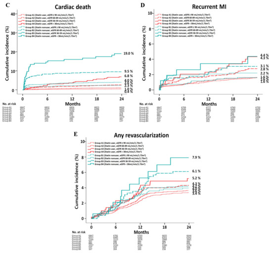 In our study, the re-MI and any repeat revascularization rates were not significantly different between the statin user and nonuser groups. Similar results were reported by Natsuaki et al. [36]. Among 14,706 patients who underwent PCI [36], the number of patients with AMI was approximately 30%. During a median follow-up of 956 days, the re-MI and any repeat revascularization rates were not significantly different between the statin user and nonuser groups according to the three different renal function groups (eGFR ≥ 60, ≤30 to <60 and <30 mL/min/1.73 m2). They [36] suggested that patients with advanced CKD (eGFR < 30 mL/min/1.73 m2) generally have advanced atherosclerosis, typically characterized by heavy calcification, and statins may no longer provide significant benefits in patients with end-stage vascular pathology. Another randomized study [37] failed to show the effects of statin therapy in decreasing restenosis. Although the study population was not confined to individuals with AMI or CKD, according to the Cholesterol Treatment Trialists’ (CTT) Collaboration report, intensive statin therapy reduced the coronary revascularization rate by about 19% (95% CI, 11–18; p < 0.0001) [38]. Walter et al. [39] found that patients receiving prolonged statin treatment developed lower in-stent restenosis rates in comparison with nonreceivers (25% vs. 38%). Therefore, our results showing similar re-MI and any repeat revascularization rates between statin users and nonusers could be related to low number of enrolled patients in groups A4, B1, B3 and B4 and relatively low incidences of these events compared with previous studies [17,30]. According to recent meta-analysis data that evaluated CKD patients [40], in which CKD was defined as eGFR < 60 mL/min/1.73 m2, results showed that the TLR/TVR (RR, 0.69; 95% CI, 0.57–0.84) was significantly reduced with DESs compared with bare-metal stents (BMS). Additionally, the use of second-generation DESs were associated with relative 27% reduction in TLR/TVR compared with first-generation DESs. Another study’s meta-analysis data [41] showed that DESs were associated with lower TVR (RR, 0.61; 95% CI, 0.47–0.80) when compared with BMSs in patients with CKD. However, we think that future studies specifically focused on advanced CKD may help to clarify the benefit of statin treatment after PCI in this group. Interestingly, the number of patients with NSTEI was increased as their renal function deteriorated (Table 1 and Table 2). Although, the precise underlying mechanisms of this phenomenon are not well known, some suggest that plaque erosion may be more predominant in the CKD group, in those patients who tend to be older and in those who have more established atherosclerosis, whereas the incidence of plaque rupture may be more common in younger non-CKD patients in whom less mature plaques are more vulnerable to rupture [42,43]. In both the statin user and nonuser groups, reduced LVEF, cardiogenic shock, CPR on admission and NT-ProBNP and LDL cholesterol levels were common independent predictors for both MACE and all-cause mortality. These variables are well-known unfavorable risk factors for mortality in patients with AMI [7,8].