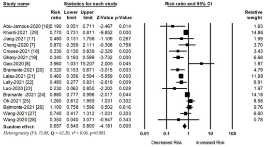 A total of 16 studies assessed the association between metformin use and the risk of mortality among patients with COVID-19. Metformin use was associated with a 35% decreased in risk of mortality among patients with COVID-19 (RR, 0.65, 95%CI: 0.54–0.80, p < 0.001) (Figure 1). There was a significant heterogeneity between the studies (I2 = 75.88, Q = 62.20, and τ2 = 0.06, p < 0.001).