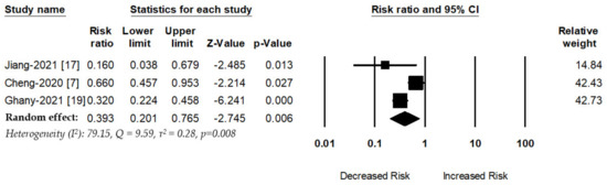 Three studies evaluated the association between metformin use and Acute Respiratory Distress Syndrome (ARDS) risk. The overall pooled effect shows that metformin use was associated with a decreased risk of ARDS among COVID-19 patients with diabetes (RR, 0.39; 95%CI: 0.20–0.76, p = 0.006, I2 = 79.15, Q = 9.59, τ2 = 0.28) (Figure 2).