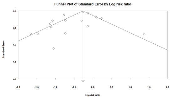 In Figure 3, the funnel plot shows no publication bias between the studies. Egger’s regression test was utilized to assess the funnel asymmetry, which indicated no publication bias (p = 0.20).