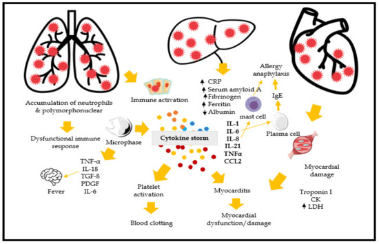 Biological mechanism of COVID-19. (Note: CRP: C-reactive protein; CCL2: chemokine ligand 2; TNF- α: tumor necrosis factor-α; IL-1, 6, 8, 18, 21: Interleukin-1, 6, 8, 18, 21; TGF-8: Transforming growth factor 8; PDGF: Platelet-derived growth factor; LDH: Lactate dehydrogenase, IgE: Immunoglobulin E).