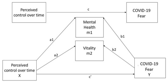 Hypothesized model. Note—perceived control over time: predictor variable; mental health: mediator 1; vitality: mediator 2; COVID-19 fear: outcome variable; a1b1: a specific indirect effect of perceived control over time on COVID-19 fear through mental health; a2b2: a specific indirect impact of perceived control over time on COVID-19 fear through vitality; c’: direct effect of perceived control over time on COVID-19 fear; total indirect effect: a1b1 + a2b2.