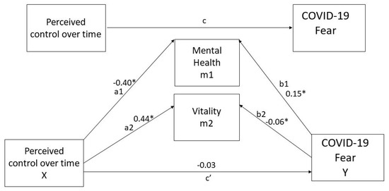 The direct effect of perceived control over time on fear of COVID-19 (c’) was −0.03 (CI: LL = −0.15; UL = 0.08: p = n.s.) (see Figure 2). In contrast, the total indirect effect via both mediators (a1b1 + a2b2) was −0.12 (CI: LL = −0.23, UL = −0.01, p < 0.001). Consequently, the total effect (a1b1 + a2b2 + c’) of X on Y was −0.15. Therefore, the total effect (c = −0.12; CI: LL = −0.23, UL = −0.01, p < 0.05) of perceived control over time on fear of COVID-19 was due to a negative indirect path, as the coefficient for direct effect (c’ = −0.03) was higher than that of the total indirect effect (−0.15). Hence, results show that mental health is a significant mediator between perceived control over time and fear of COVID-19 whereas vitality is not.