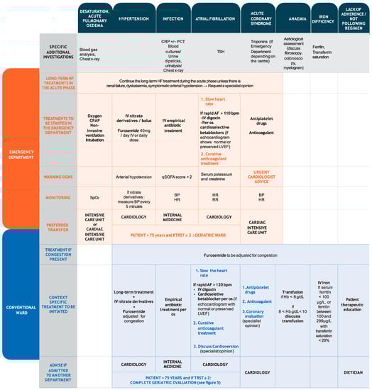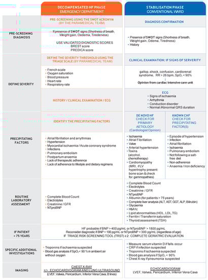 Alternatively, precipitating factors causing decompensation requiring urgent correction can be prioritised, including acute coronary syndrome, hypertensive emergency, rapid arrhythmia, severe bradycardia, conduction disturbance, acute mechanical cause, or acute pulmonary embolism (PE) [].