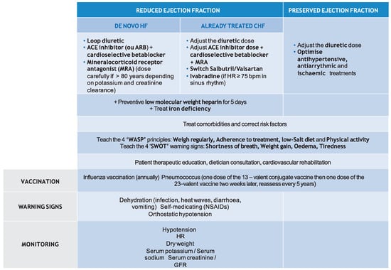 Decompensated HFrEF patients should have their diuretic dose adjusted for congestion, and BBs, MRA, ACE-I and RAAS inhibitors titrated if required. Preventive low molecular weight heparin for 5 days and ID correction can also be considered. []