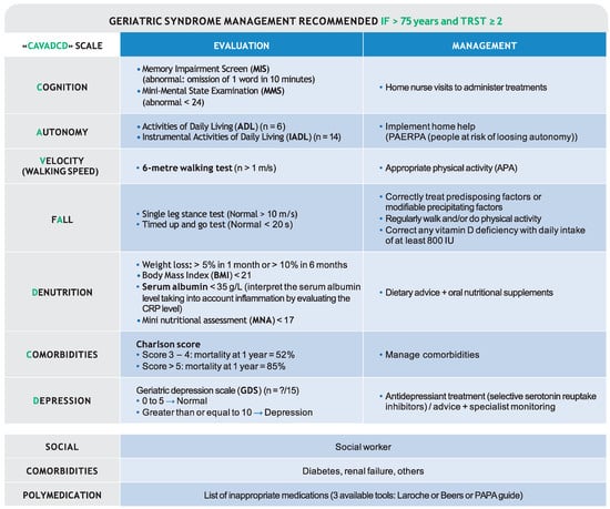 Older patients requiring a geriatric evaluation must be identified. A prospective, national, multicentre study showed the triage risk screening tool (TRST) is useful []. The TRST measures five indicators: cognitive disorders, difficulty walking/moving/falls, polymedication, history of hospitalisation in the last 90 days or admission to the ED in the last 30 days [] and loss of autonomy. It should be performed within 48 h of admission for any patient aged > 75 years. A score > 2 indicates geriatric referral is needed. The authors suggest using the CAVADCD scale, with warning signs of looming death (Cognition, Autonomy, Velocity, fAlls, Denutrition, Comorbidities, Depression) as the basis for a comprehensive geriatric evaluation. (see Figure 5).