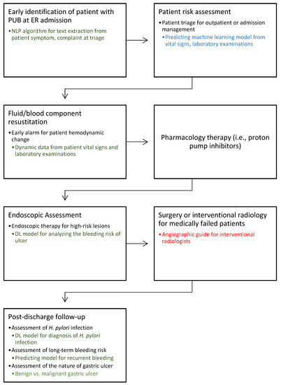 Risk factors leading to PUB must be identified to prevent PUB recurrence after the initial bleeding episode. H. pylori infection and the use of nonsteroidal anti-inflammatory drugs (NSAIDs), including low-dose aspirin, are well-recognized risk factors of PUB. Recently, the use of DL has been increasingly evaluated for the computer-aided diagnosis of H. pylori during endoscopy. Regarding accuracy, sensitivity, and specificity in detecting H. pylori infection during endoscopy, this AI model achieved 87.1% (95% confidence interval (CI) 81.8–91.1), 86.3% (95% CI 80.4–90.6), and 87.1% (95% CI, 80.5–91.7), similar to human endoscopist scores of 82.9% (95% CI, 76.7–87.7), 79.6% (95% CI, 68.1–87.7), and 83.8% (95% CI, 72–91.3), respectively [30].