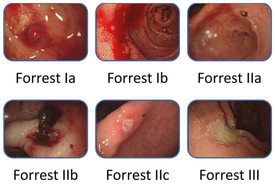 - Mondardini, A.; Barletti, C.; Rocca, G.; Garripoli, A.; Sambataro, A.; Perotto, C.; Repici, A.; Ferrari, A. Non-variceal upper gastrointestinal bleeding and Forrest’s classification: Diagnostic agreement between endoscopists from the same area. Endoscopy 1998, 30, 508–512. [Google Scholar] [CrossRef]
