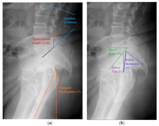 - Barrey, C.; Jund, J.; Noseda, O.; Roussouly, P. Sagittal balance of the pelvis-spine complex and lumbar degenerative diseases. A comparative study about 85 cases. Eur. Spine J. 2007, 16, 1459–1467. [Google Scholar] [CrossRef] [Green Version]