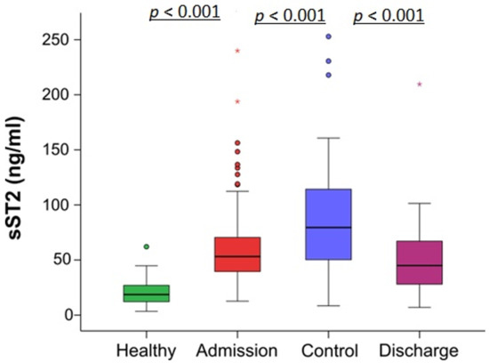 In COVID-19 patients sST2 concentrations peaked at 48–72 h control measurement, representing on average a 150% increase over admission (53.1 ng/mL (IQR: 30.9) admission vs. 79.3 (IQR: 64.2) control; p < 0.001). sST2 concentrations at discharge had significantly declined (44.9 ng/mL (IQR: 39.6); p < 0.001) but were still significantly above healthy donor’s levels; Figure 1.