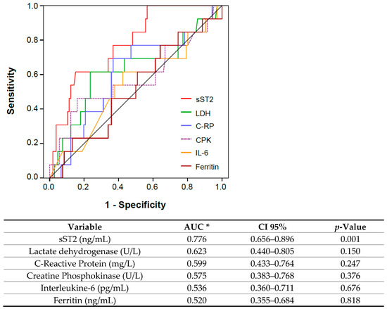 Receiver operating characteristic curves comparing sST2 concentrations at admission with C-reactive protein (C-RP), lactate dehydrogenase (LDH), ferritin and interleukine-6 (IL-6) concentrations at admission. * Area Under Curve.