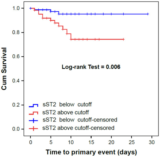 - Sánchez-Marteles, M.; Rubio-Gracia, J.; Peña-Fresneda, N.; Garcés-Horna, V.; Gracia-Tello, B.; Martínez-Lostao, L.; Crespo-Aznárez, S.; Pérez-Calvo, J.I.; Giménez-López, I. Early measurement of blood sST2 is a good predictor of death and poor outcomes in patients admitted for COVID-19 infection. medRxiv 2021. [Google Scholar] [CrossRef]