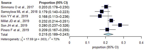 The incidences of inadequate US examination in each study are summarized in Figure 2. In a total of 4250 patients in six studies, the pooled incidence of inadequate US examination was 21.5% (95% CI, 18.9–24.3%; I2 = 72%). In subgroup analyses, the surveillance cohort, surveillance test, and reference standard were significantly associated with study heterogeneity (p ≤ 0.04; Table 2). In studies including both patients with and without hepatic observations in the surveillance cohort, the incidence of inadequate US examination was 23.2%, which was significantly higher than that in studies including only patients with hepatic observations (18.8%, p = 0.03). In addition, a higher incidence of inadequate US examination was shown in studies that used US alone compared with those that used US plus AFP (28.0% vs. 20.8%, p = 0.008), and in those that used pathologic and imaging diagnoses as a reference standard compared with those that used imaging diagnosis only (23.2% vs. 17.9%, p = 0.02).