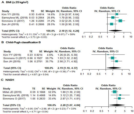 Forest plots of the odds ratios of BMI (≥25 kg/m2) (A), Child–Pugh classification B (B), and NASH (≥100 ng/mL) (C).