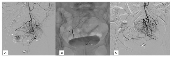 Fifty-two-year-old female with grade IV hemorrhoids disease and a low quality life and inability to do a regular work. (A) Subtracted digital arteriography of the inferior mesenteric artery. Visualization of the rectal branches (white arrows) and of the CCR arteries (black arrowhead) with a type 1 vascularization according to the Thomson classification. (B) Non-subtracted single-shot fluoroscopy after embolization with metallic coils of the sigmoidal arteries. On the left, a proximal embolization with a packing coil (black arrow). On the right, a more distal embolization with regular coils (white arrow). (C) Subtracted digital arteriography of the inferior mesenteric artery after embolization shows complete exclusion of the CCR arteries (no vascularization below the pubic symphysis).
