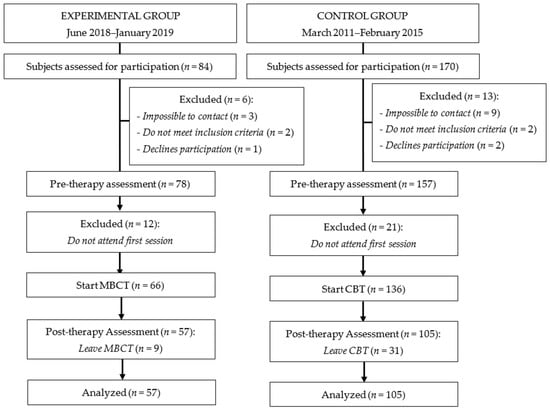 Thus, between June 2018 and January 2019, a sample of 57 participants was obtained through a convenient, non-randomized sample obtained from the waiting lists at the pain units of three hospitals located in the province of Alicante: General University Hospital of Alicante (GUHA), Marina Baixa Hospital (MBH) (Villajoyosa), and the Vega Baja Hospital (VBH) (Orihuela). The same sampling method was utilized at the pain unit at the GUHA, where Cognitive Behavioral Therapy for chronic pain was implemented between March 2011 and February 2015. This sample was constituted of the non-equivalent control group from a previous cohort (n = 105).