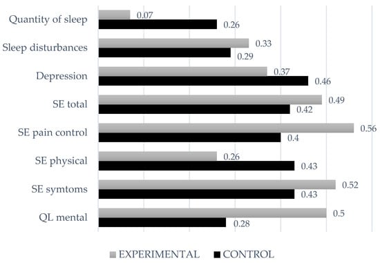 Lastly, analysis of intragroup differences revealed that 14 of the 18 variables studied improved in the control group, while in the experimental group, improvements were only observed in 10 out of 18 variables. In both groups, improvements were observed in the perception of pain in the past 3 days, subjective quality of health, self-efficacy (in all dimensions), depression, and sleep alterations and quantity. Although the experimental group obtained larger effect sizes in almost all the variables (0.07 < d < 0.56), except for depression and self-efficacy, the control group obtained a larger effect size in the management of physical symptoms (see Figure 2). Ultimately, the effect sizes found in both therapies were small to medium at most (in CBT 0.2 < d < 0.46).