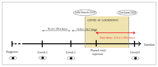 Graph showing the timeline and visits included in the study. The period of COVID-19 lockdown lasted from 14 March 2020 to 21 June 2020. Covid-2 and Covid-1 are the two last visits before the restriction period where the visit/injection was scheduled. Covid 0 corresponds to the first visit after the lockdown period ends. Real delay (in red) was calculated as time from their planned visit/injection to the date the patients resumed their follow-up at Covid 0 visit.
