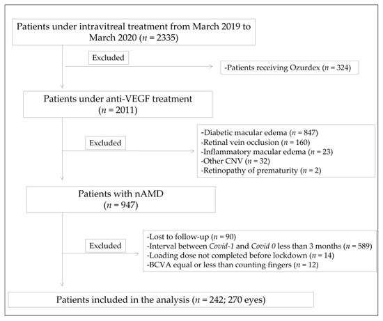 The year before the lockdown (from 13 March 2019 and 2020), 2335 patients were under intravitreal treatment at San Carlos Clinical Hospital, in Madrid. Of these, 324 were receiving dexamethasone implant (Ozurdex) and the remaining 2011 were receiving anti-VEGF agents. Discarding diagnoses such as diabetic macular edema, retinal vein occlusion and CNV with etiology different from AMD, 947 patients diagnosed with neovascular AMD were selected. Further application of exclusion criteria resulted in the final data set for this study: 270 eyes of 242 patients (flow chart available in Figure 2).