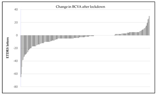 It is essential to ascertain how many of those ETDRS letters that were lost during the restrictions of the pandemic will be recoverable with adequate treatment afterwards. We grouped the eyes losing more than 5 letters (29% in our sample) using this provisional threshold based on findings in the PIER study [11] as a possible point-of-no-return after lockdown. In PIER, a clinical trial, after the loading dose, injections were administered every three months. By month 24, a change of −2.2 and −2.3 letters was found for the dose of 0.3 and 0.5 mg of ranibizumab, respectively. In the second amendment of the protocol, 87 patients were rolled over from quarterly to monthly injections. The result was a gain of 2.2 and 4.1 letters in the 0.3 mg and 0.5 mg after rollover, respectively. If these findings could be applied to COVID-19 lockdown, it would lead us into expecting some improvement in patients losing less than 5 letters over time with reestablishment of proper treatment. However, real life studies find that after six months of proper treatment, although percentage of active OCT is restored, BCVA is not [19].