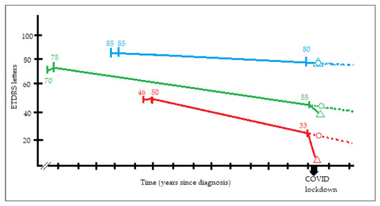 Graph showing three representative examples (blue, green and red lines) of visual decay approximation calculated for each patient of our study. In every line there are three points with numbers (visual acuity in ETDRS letters) and two symbols. The first point is visual acuity at diagnosis at the corresponding year. The second point is visual acuity after loading dose. The third point is visual acuity at Covid-1. From the second point to the third, we have considered a line, that has been prolonged (dotted line) matching expected visual acuity at Covid 0 (represented as a circle). Actual visual acuity at Covid 0 is represented as a triangle. For each patient in our study, the difference in Covid 0 between expected visual acuity and actual visual acuity is the visual loss we have attributed to COVID-19 lockdown mediated delays in follow-up and intravitreal injections.