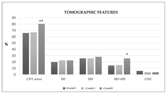Percentage of eyes with different tomographic features. CNV: choroidal neovascularization; IRF: intrarretinal fluid; SRF: subretinal fluid; CME: cystoid macular edema. ** p < 0.001, * p < 0.01, for Covid 0 vs. Covid-1 comparison.