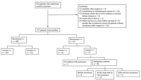 - Yajima, K.; Kanda, T.; Ohashi, M.; Wakai, T.; Nakagawa, S.; Sasamoto, R.; Hatakeyama, K. Clinical and diagnostic significance of preoperative computed tomography findings of ascites in patients with advanced gastric cancer. Am. J. Surg. 2006, 192, 185–190. [Google Scholar] [CrossRef]