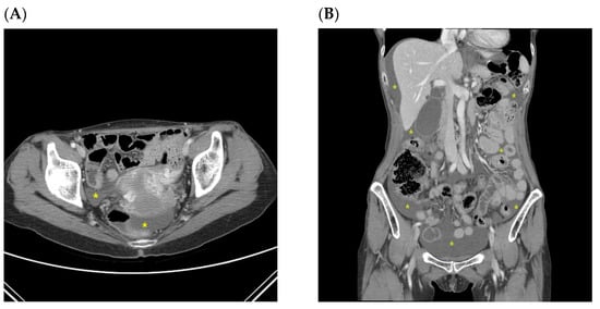 - Cheon, H.J.; Ryeom, H.K.; Bae, J.H.; Jang, Y.J.; Kim, G.C.; Kim, J.H.; Shin, K.M.; Chung, H.Y. Clinical significance of a small amount of isolated pelvic free fluid at multidetector CT in male patients after curative surgery for gastric carcinoma. J. Korean Soc. Radiol. 2014, 71, 69–74. [Google Scholar] [CrossRef]