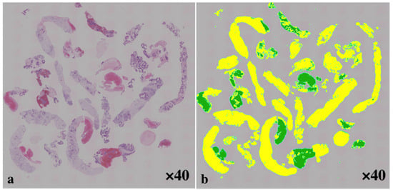 Histological evaluation (a) Hematoxylin and eosin staining (H and E, ×40) of a gross specimen obtained from the pancreatic cancer using a 22-gauge Franseen needle, viewed in a low power field. (b) Measuring the area of the specimen (green), excluding the blood clots (yellow), using imaging software (BZ-X800; Keyence Corporation, Osaka, Japan).