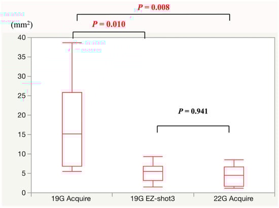 A scatter plot showing the amount of tissue obtained is shown in Figure 3. The amount of obtained tissue with the 19-gauge Franseen needle was approximately three times as large as that obtained with the 19-gauge conventional needle (median, 15.20 μm2 vs. 5.44 μm2, p = 0.010) and that obtained with 22-gauge Franseen needle (median, 15.20 μm2 vs. 4.49 μm2, p = 0.008).